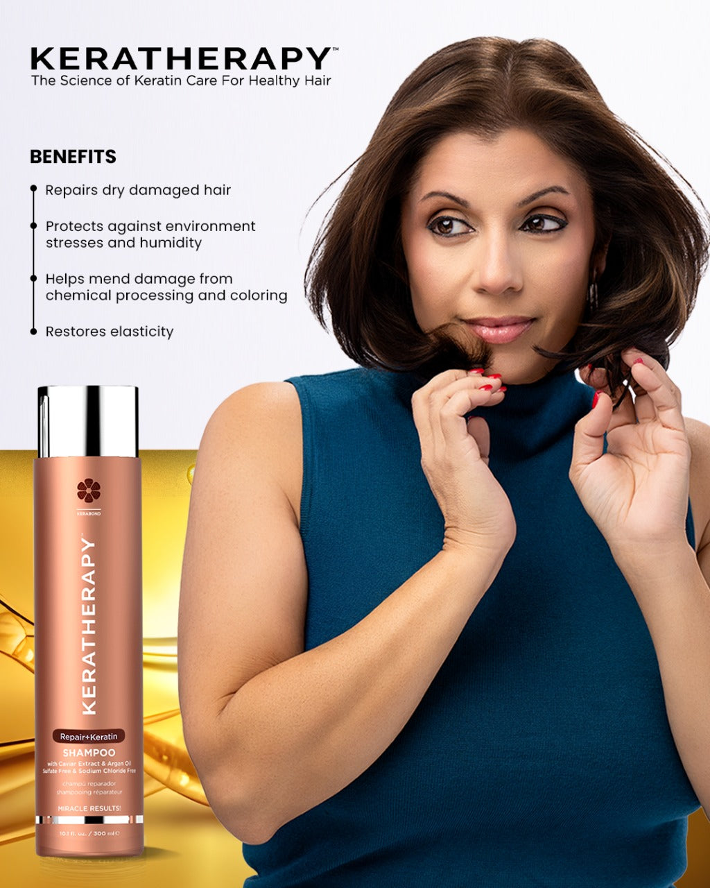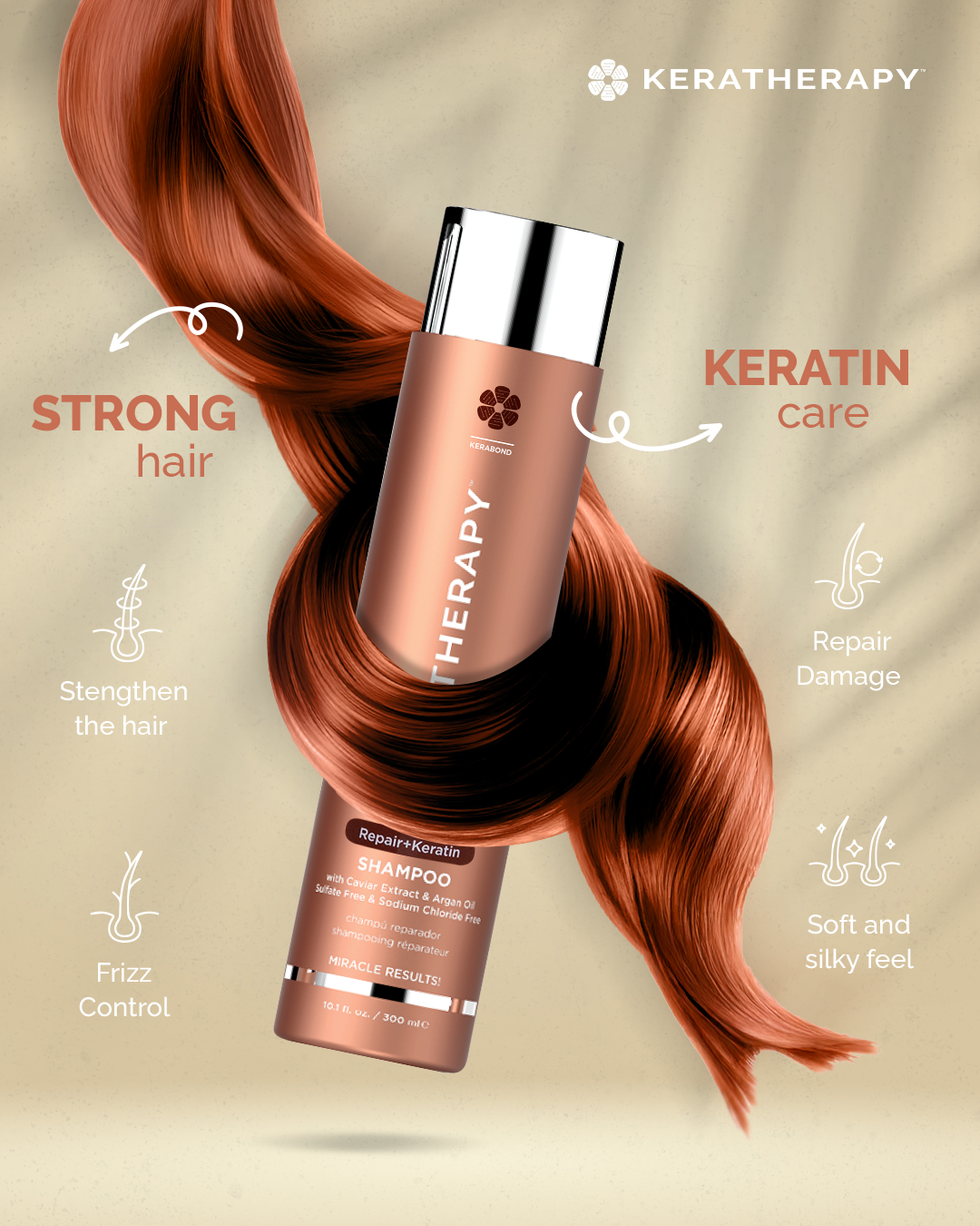 Todas las colecciones de cuidado del hogar de KERATHERAPY cuentan con la exclusiva tecnología KERABOND, que combina queratina con el grupo específico de agentes orgánicos, botánicos, aminoácidos y acondicionadores de cada producto. Este complejo súper acondicionador se entrega a las áreas del cabello donde más se necesitan.